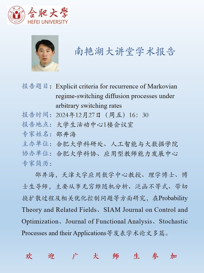【南艳湖大讲堂】Explicit criteria for recurrence of Markovian regime-switching diffusion processes under arbitrary switching rates