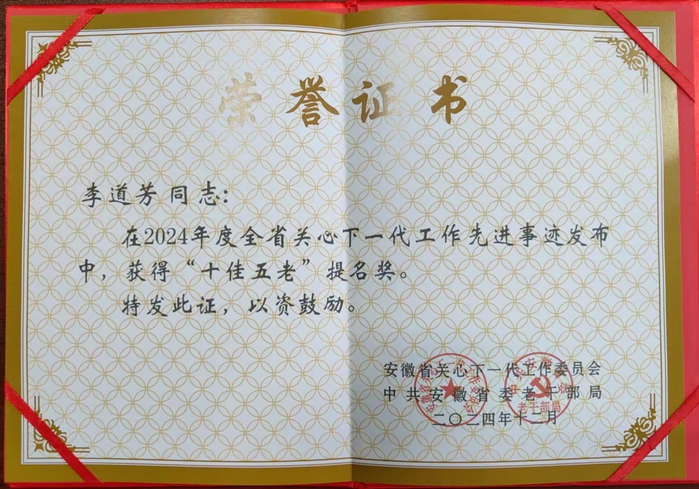 2月28日下午,合肥市关工委2025年度工作会议在市政务中心召开。会上开展了合肥市关心下一代工作“双十佳两示范”(双十佳:十佳工作集体、十佳“五老”;两示范:示范“五老”工作室、示范工作品牌)命名工作,ac米兰关工委荣获“十佳先进集体”。此外,在2024年度全省关心下一代工作“十佳五老”先进事迹发布活动中,李道芳教授荣获提名奖。