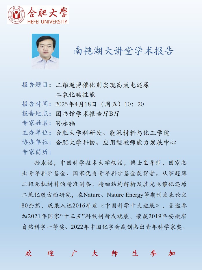 【南艳湖大讲堂】二维超薄催化剂实现高效电还原二氧化碳性能