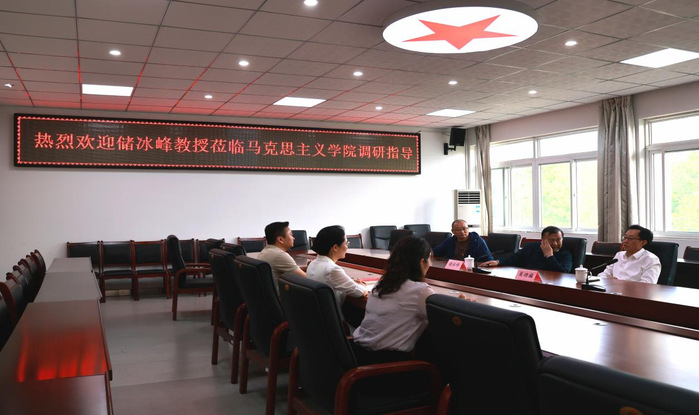 报告会结束后,吴功福陪同储冰峰教授前往马克思主义学院开展调研座谈。座谈会上,储冰峰围绕课程创新、课题研究、师资培养及科研合作等方面,为学院发展提出了一系列建设性建议。吴功福表示,要深入学习贯彻习近平总书记对学校思政课建设重要指示精神,加强校内外思政资源整合,构建思政大课堂,创新推动思政课建设内涵式发展,把道理讲深讲透讲活,不断提高思政课的针对性和吸引力。马克思主义学院负责人表示,将以此次交流为契机,充分吸收专家意见,持续深化教学改革,提升科研创新能力,切实将党史学习教育成果转化为育人实效,为推动学校高质量发展、培育担当民族复兴大任的时代新人贡献力量。