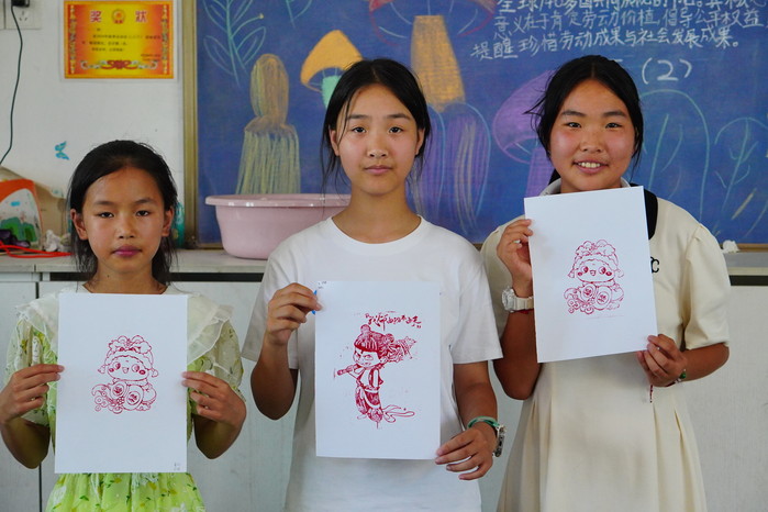 为进一步讲好中国故事,推广中华优秀传统文化,志愿者们依托挑战杯省赛获奖项目,以“朱砂拓福” 为主题讲述年画的历史渊源与文化寓意。孩子们亲手体验拓印工艺,感受传统艺术的博大精深。朗诵课上,志愿者们以毛泽东诗词《沁园春·长沙》为主要教学内容,从字词解析到情感把握展开系统性的指导。绘画课与手工课上孩子们尽情创作,一幅幅充满童趣的图案,一件件独具匠心的作品,既保留了传统文化的吉祥寓意,又融入了孩子们的奇思妙想。