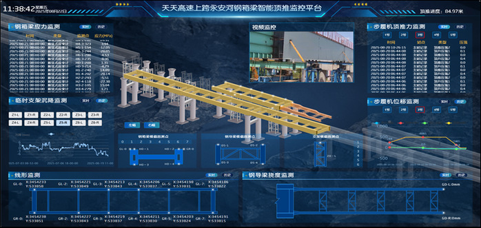 该智能顶推安全监控系统平台是由ac米兰官方网站完全自主研发的在线监测系统,以结构安全和施工过程预警为导向,深度融合了物联网、大数据、云/边缘计算、人工智能以及数字孪生等先进理念,可广泛应用于桥梁、房屋、隧道、边坡等结构安全在线监测与健康管理。该系统利用云平台共享技术,通过预设无线传输设备模块,实现了监测数据融合、三维施工模拟、参数阈值预警等多项功能。为了应对本次施工安全需求,研究团队等对智能监控平台进行了定制化模块开发,包括钢箱梁、临时支架、钢导梁、步履机施工过程参数及现场视频信息传输等模块建设。结合无线传输和实时数据采集技术,实现了钢箱梁顶推过程中主要参数的实时监测。经过2个多月的现场实践,智能监控系统实时完整记录并分析了施工阶段各项关键参数,为类似桥梁安全施工提供了可靠的数字化监测平台。