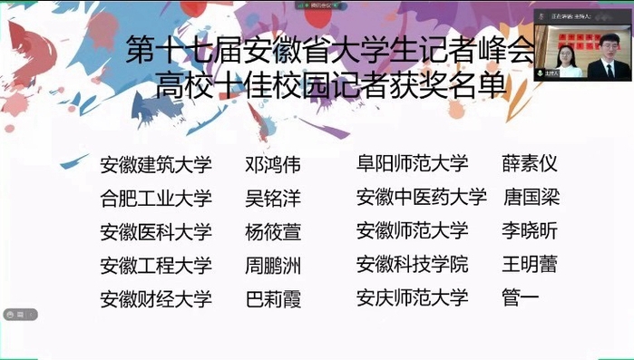 本届峰会共收到全省50余所高校的参赛作品近600份。会上,主持人宣读了2020年度“十佳校园记者”、“好新闻奖”以及“主题征文”比赛获奖名单,并邀请获奖学生代表线上发言。