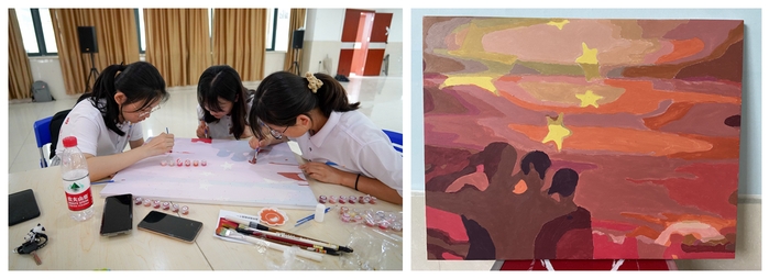 手绘我的祖国。习近平总书记在庆祝中国共产党成立一百周年大会上对青年提出希望:“未来属于青年,希望寄予青年”,台下无数青年以“请党放心,强国有我”与之回应,其声久久回荡在天安门广场之上,让人热血澎湃。五星红旗冉冉飘起,志愿者们面向国旗,庄严肃穆,这就是当代青年心中祖国最美的样子。实践团队的成员们纷纷将红色颜料沁入笔尖,一笔一画中包含着对祖国的美好祝愿。