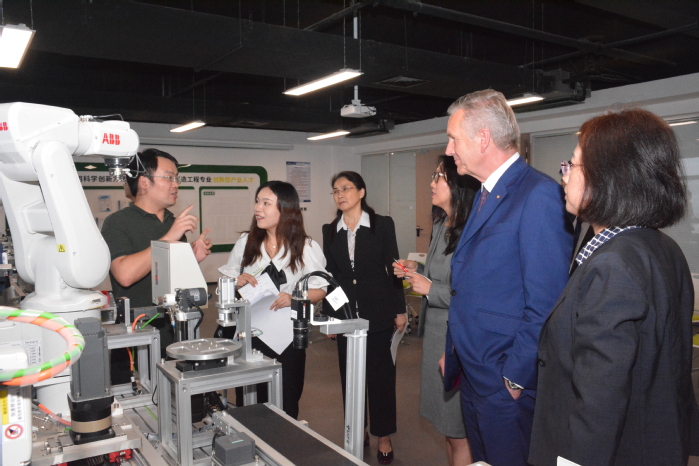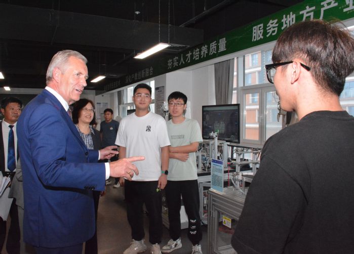 武尔夫一行还参观了大众学院校企实训平台,在多模态设备健康评估实验室、智能制造系统集成技术应用及创新中心、数字孪生技术及工程应用中心调研了学科建设、模块化课程、实训教学等情况,高度肯定了ac米兰“地方性、应用型、国际化”的办学定位。