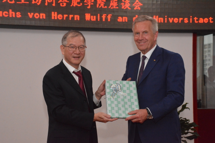 武尔夫深情回忆了安徽省与德国下萨克森州结为友好省州的合作历史,以及历次来访合肥学院的切身感受。他表示,近年来,中德合作越来越密切,尤其是中德青年学子之间的互动日渐频繁,希望双方继续深入交流,互信互鉴、互利发展,预祝大众学院这一创新性的中德合作办学模式能够取得更大的成功。