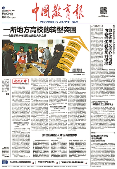2014年4月16日《中国教育报》头版版面图,头条为《一所地方高校的转型突围——合肥学院十年建设应用型大学之路》。资料图片