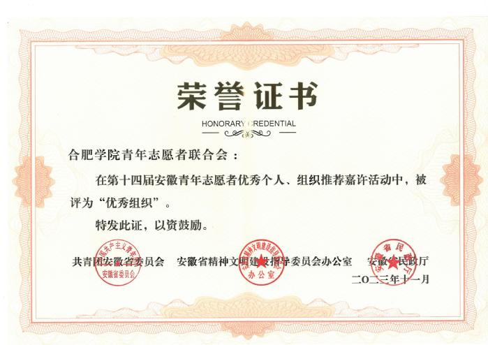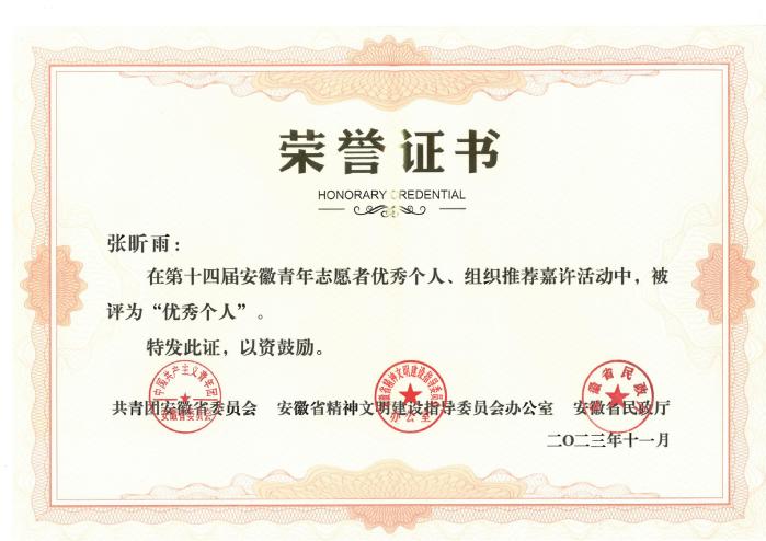 近日,由团省委、省文明办、省民政厅联合开展的第十四届安徽省青年志愿者“优秀组织”“优秀个人”名单公布,ac米兰青年志愿者联合会获评“安徽省青年志愿者优秀组织”,经济与管理学院张昕雨同学获评“安徽省青年志愿者优秀个人”。