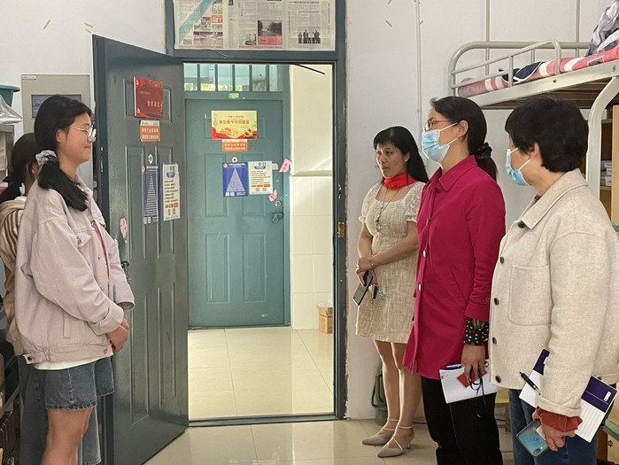 走访过程中,陈秀叮嘱同学们要紧绷疫情防控之弦,积极配合学校疫情防控工作;优化时间安排,静下心、多思考,高质量完成线上学习任务;注意宿舍卫生,勤通风、多消毒;加强体育锻炼,提高身体素质。随后,她与学生们亲切交谈,详细了解了学生们在封校期间所遇到的困难以及她们在线上学习、公寓住宿、寝室卫生、食堂供应、文体活动等方面的建议。陈秀表示,困难都将被解决,疫情终将会过去,希望同学们积极适应新情况,继续坚持每日健康打卡,做好个人防护,及时上报异常情况。