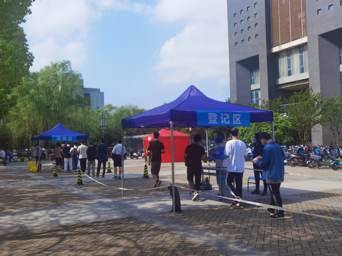 上午八点半,全员核酸检测正式开始。检测现场严格落实疫情防控要求,参检师生佩戴口罩间隔1米排队,查验健康码和行程码、测温、信息登记、咽拭子采样、离场……全体人员积极配合,一切有条不紊。在现场,党政办、人事处、学生处、公管处、后勤集团、保卫处等相关部门和各二级学院领导老师协助开展信息录入、秩序维护等核酸检测志愿服务工作,烈日炎炎,厚重的防护服下凝满了细密的汗珠,但他们却始终与医护人员并肩坚守在“疫”线。